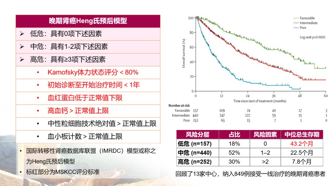 接下来靶向治疗继续不断发展,临床经验逐渐丰富,全程管理概念兴起,晚期肾癌的OS不断延长,总生存接近3年。然而肾癌的生物学行为复杂多变,靶向药物作用在不同患者效果不一,为了预测靶向药物治疗的疗效,建立了Heng氏模型,模型把患者划分为低、中、高危三类。靶向治疗药物对于低危患者更敏感,低中危患者在真实世界超过了70%,患者总生存超过3年,而高危患者靶向治疗的总生存只有7.8个月,这也就提示晚期肾癌患者的分层对于治疗尤为重要。